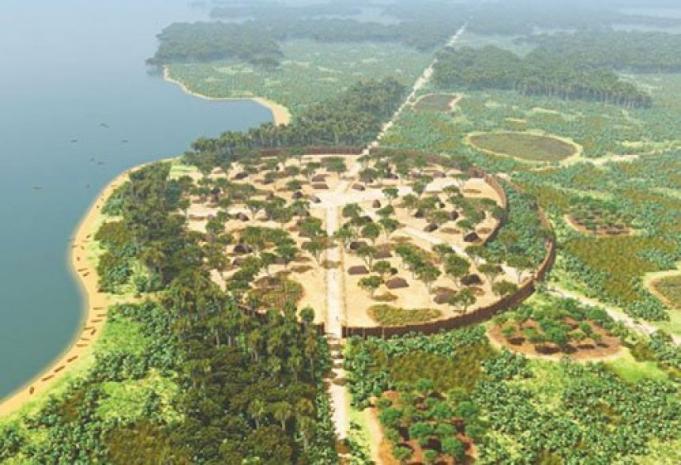 La conception d’un artiste montre un village Xinguano de l’Amazonie brésilienne tel qu’il aurait pu apparaître avant 1492.